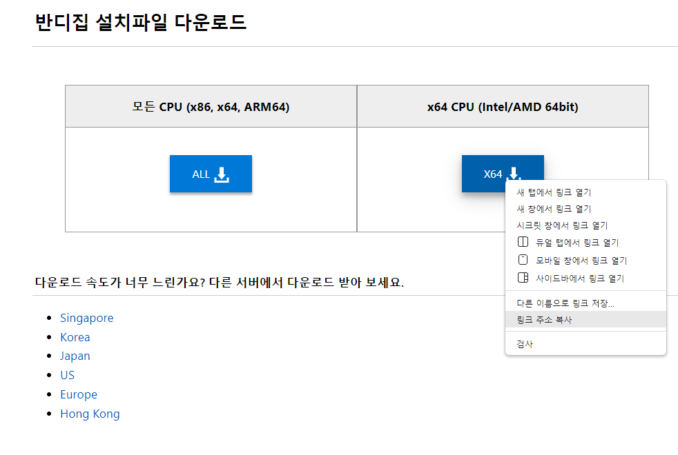클릭시 exe 파일을 받는 링크를 우측클릭후 링크주소 복사 하면된다.