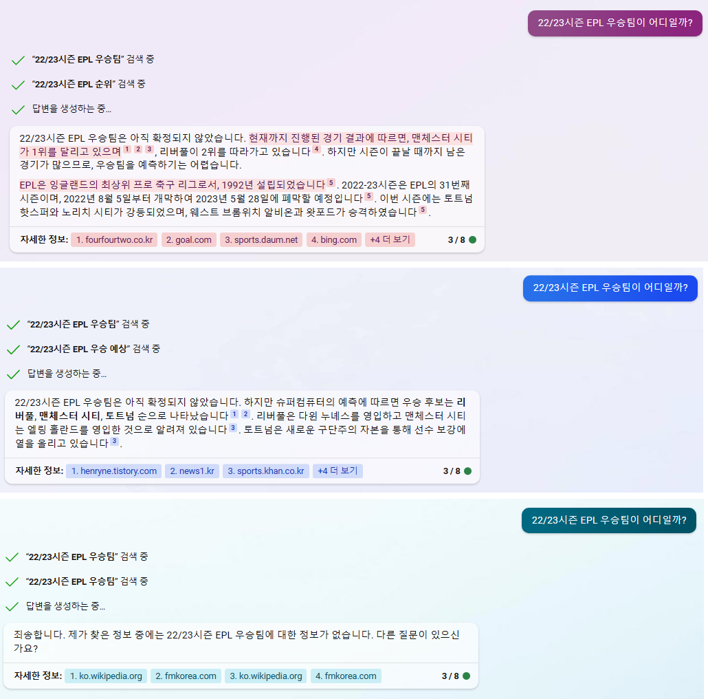 빙 GPT는 최신 데이터를 신뢰된 데이터가 아닌이상 잘 안믿는 경향이 있는 듯 하다.