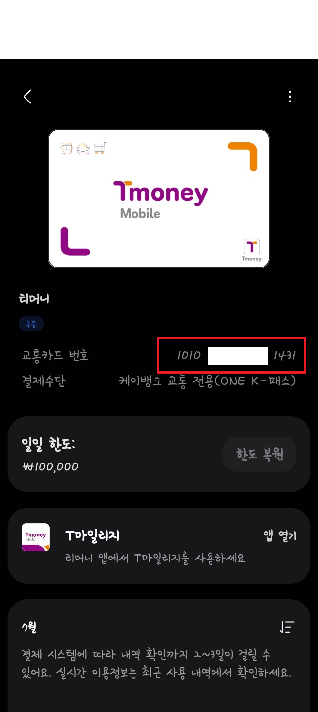케이뱅크에서 제공해주는 모바일에 있는 교통카드번호가 아닌