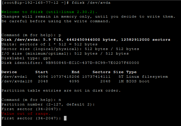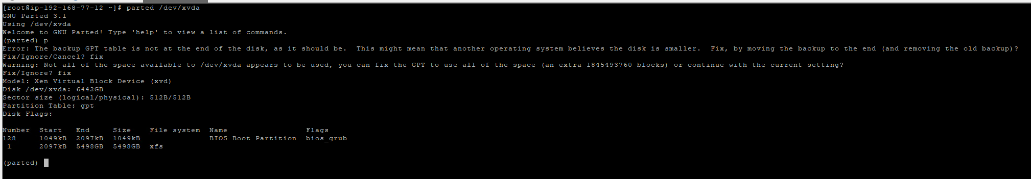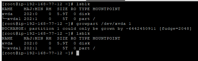 NOCHANGED: partition 1 could only be grown by -6442450911 fudge=2048 에러를 뱉으면서 불가능하다고 나온다.